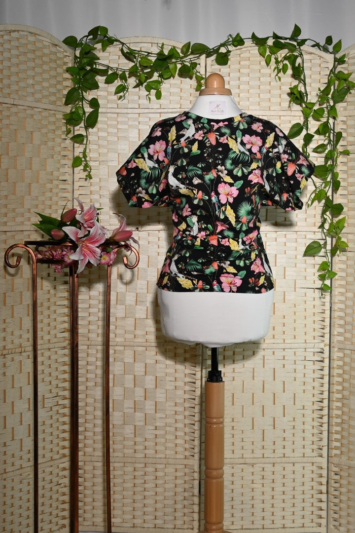 Schwarzes Shirt mit bunten Blumen/ Hibiscus